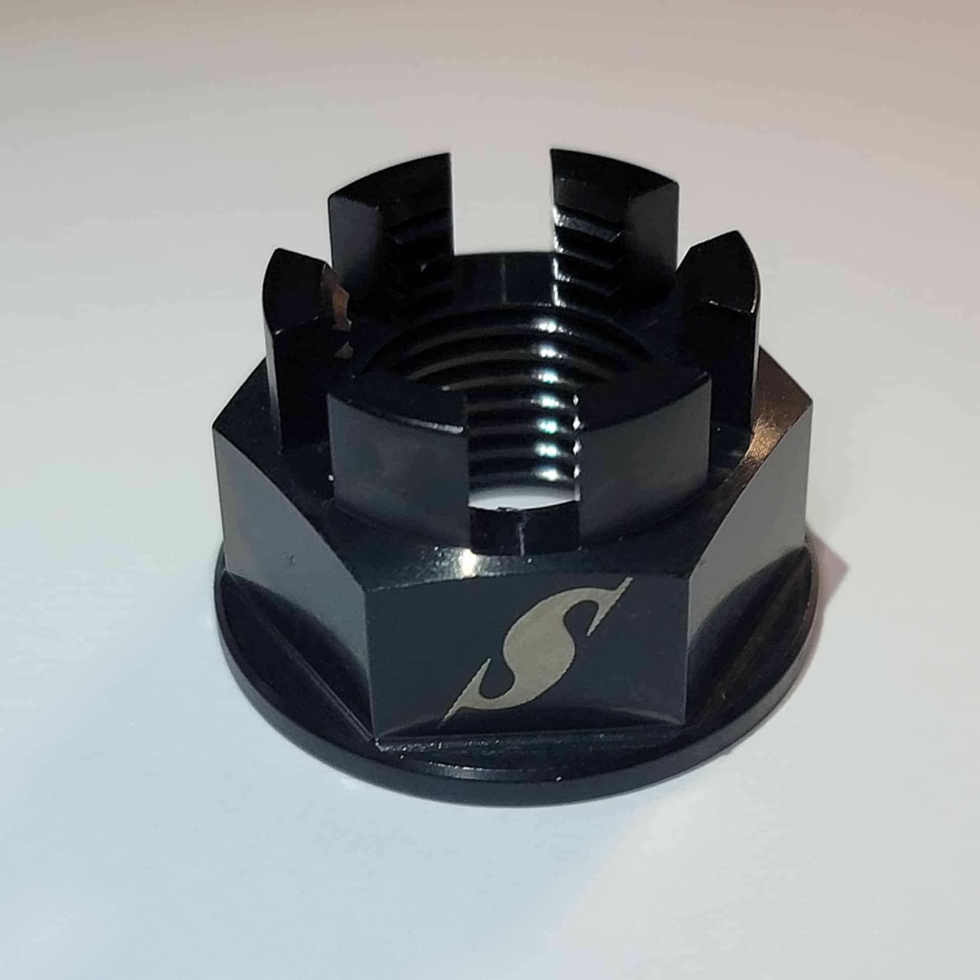 Spears Racing’s Titanium Castle Nut 16mm x 1.5mm Black/Natural Axle Nut “Wurx” Our Titanium 6AL-4V (grade 5) Nuts are highly corrosion resistant, extremely light (45% weight saving!) and with rolled threads offers excellent strength and quality. These nuts are an extra visual in the design and a bigger weight saving over OEM Nuts.