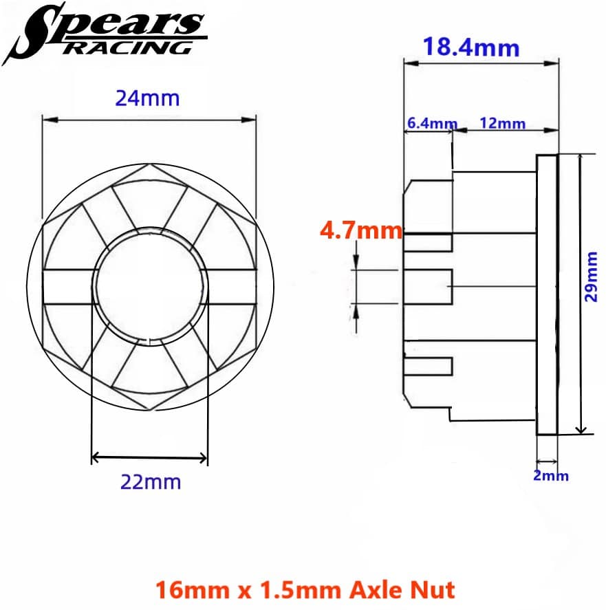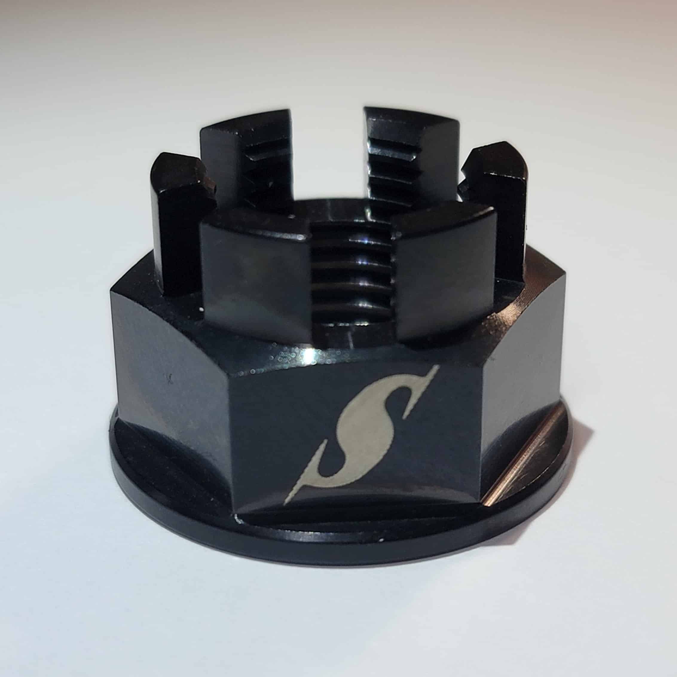 Spears Racing’s Titanium Castle Nut 16mm x 1.5mm Black/Natural Axle Nut “Wurx” Specs: