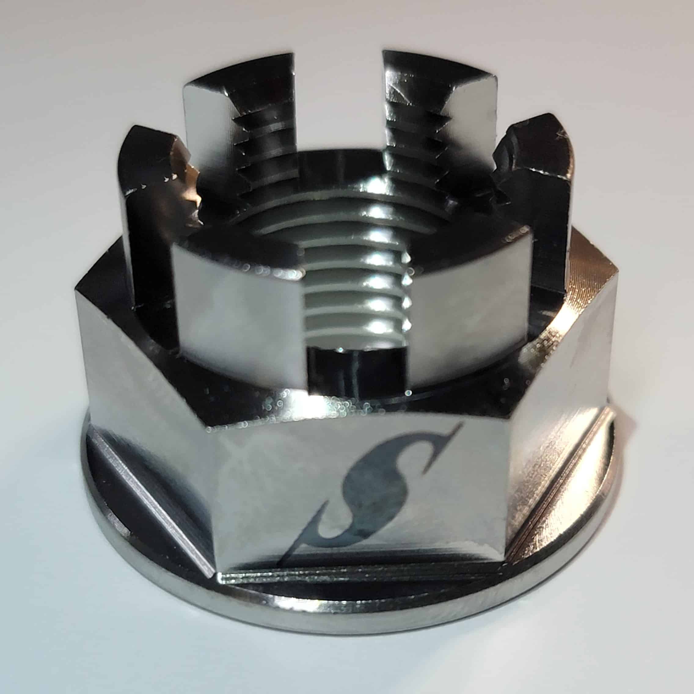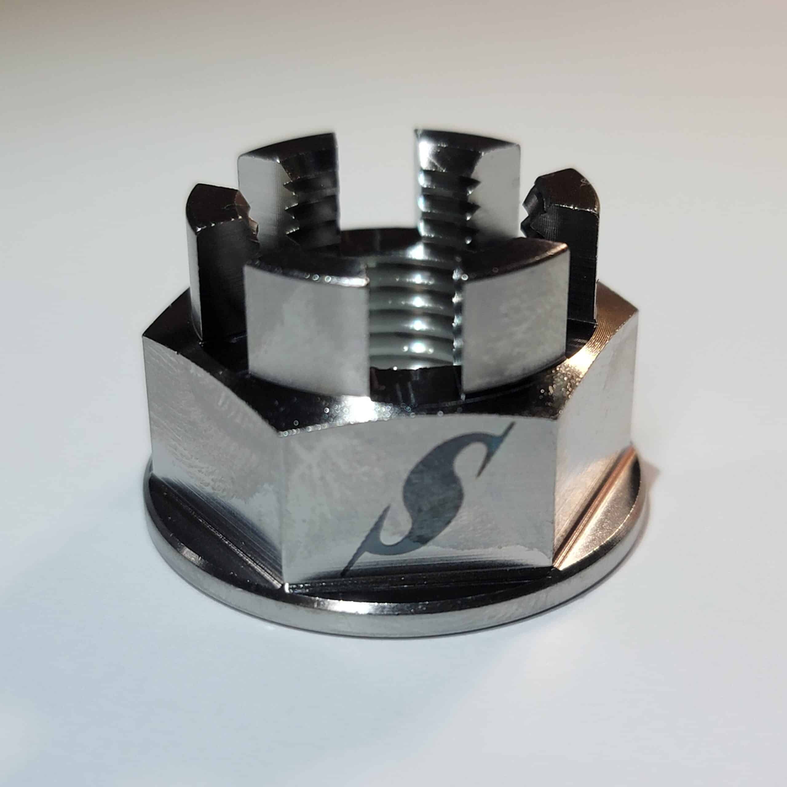 Titanium Castle Nut 16mm x 1.5mm Axle Nut “Wurx” Is made with the Weight reduction and Appeal to the eye.
